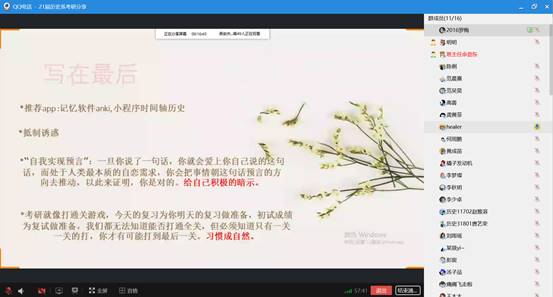 胡奇杭对专硕、学硕做了区分,并对考试规律、不同院校的差异化政策以及调剂资格等问题进行了深入阐释,跟同学们一起交流了开设有学科教育专业的院校的特色;刘艳蕾对自己考研的心路历程作了分享,并以“成功之路”为话题,阐述了自己考研的历程、备考时的心态调整;罗梅在择校、考研英语、政治、专业课方面作了详细的说明,为同学们提供了一批学习资源,交流了考研过程中的学习途径与方法;王玉龙用整理出的数据,在择校方面作了精细的阐释,他鼓励同学们找几个志同道合的研友,相互鼓励,互相督促;徐琦在考研的情感波动和资料的选择上提供了建议,就备考和心态调整提出了一些看法。