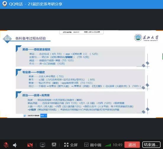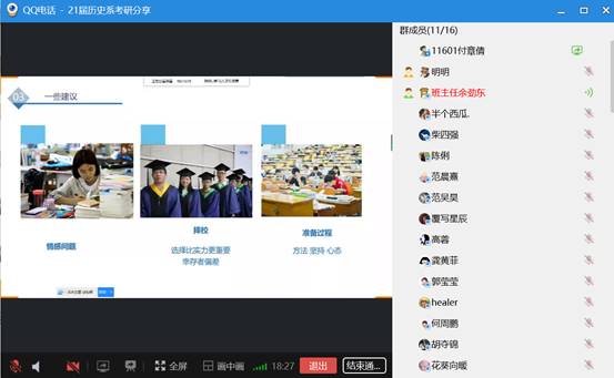 (通讯员:王明明)为了对历史系本科生进行研究生入学考试的针对性指导,在余劲东老师、陈力老师的积极动员下,2017级历史系邀请到了7位2020年成功考取研究生的同学于5月28日(周四)晚间在线进行考研经验交流与分享。由于会议以网络方式举行,且主要涉及到考研择校、复习方法等具有普遍共性的问题,因此还邀请了17级其他专业对考研感兴趣的同学自愿参与。