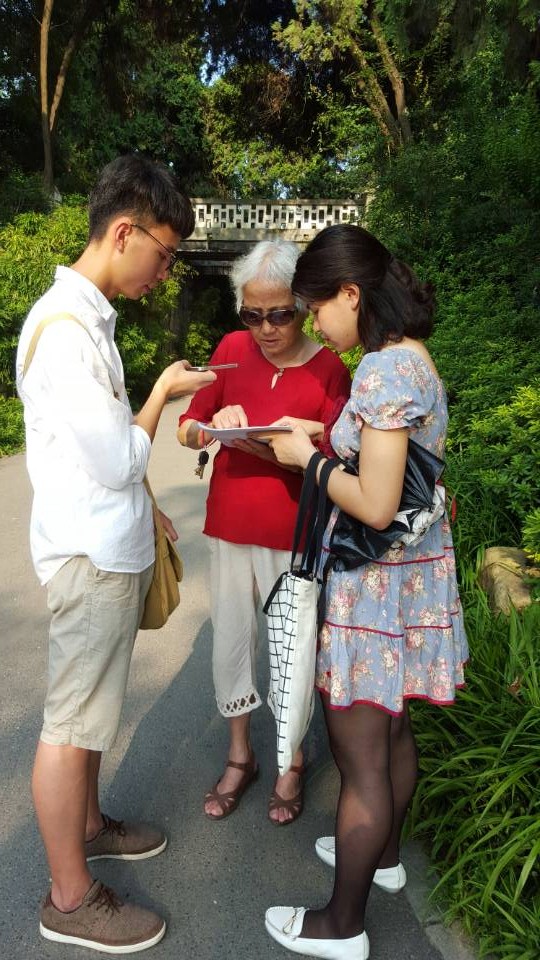 调查组的同学们在公园门口进行了工作分配,她们将调查词表平均分给组内成员,准备分头行动。“我猜今天下午很快就能调查完。”其中一位同学自信的说到。然而事与愿违,调查一开始便屡屡碰壁,接连几位被调查对象都不愿配合调查。两位年岁较大的调查者不等调查员解释便直接回绝到“我们不接受调查,你们去问别人吧。”