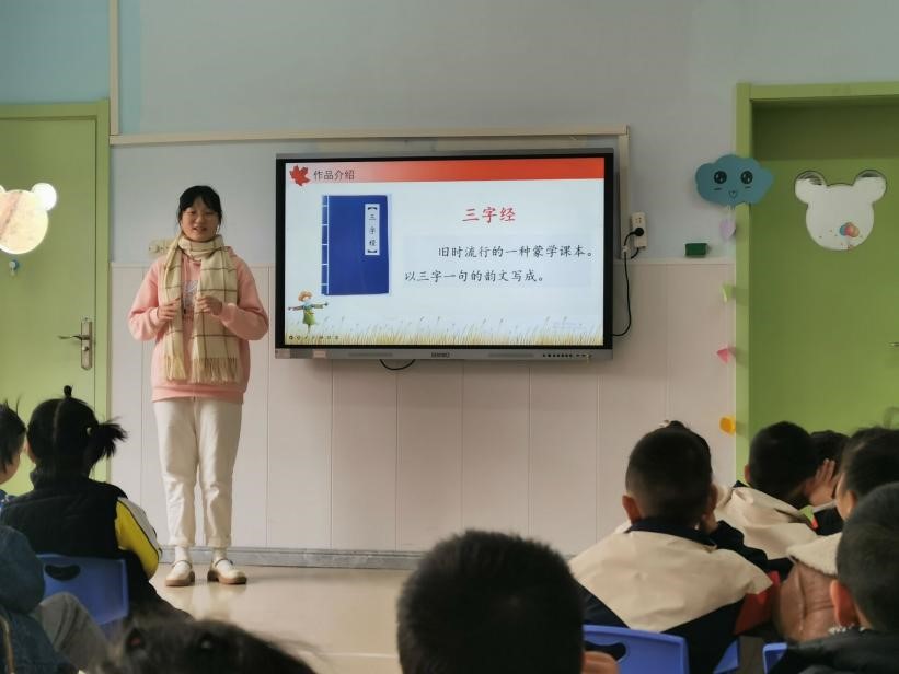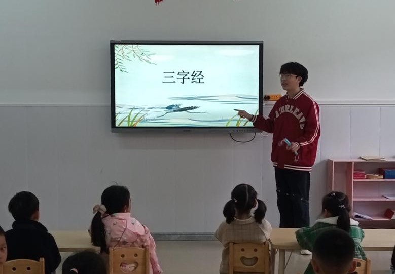 本周国学课程共进行了5天,15名志愿实习讲课员工自行组队,各自选定授课时间段及班级,并自行选择讲课内容进行20至30分钟时间的授课,授课班级为4个中班和3个大班,每班30名小朋友。同学们选择《三字经》《百家姓》《弟子规》、唐诗等国学启蒙文本,运用在课堂上所学的语文教学技能,精心备课,并结合图片、歌曲、吟诵、手语等丰富的形式,引导幼儿园的小朋友们体验国学的精髓。课堂上,幼儿园的小朋友们活泼可爱、热情礼貌,踊跃回答同学们的提问,体现出best365英国体育在线幼儿园在幼儿教育方面颇有成效。