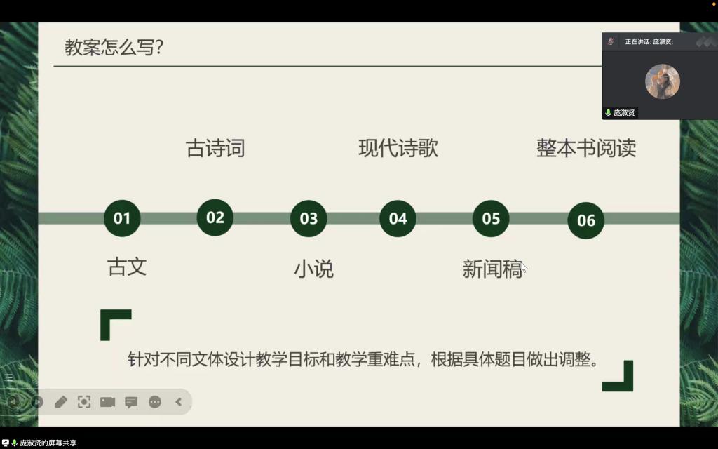 庞淑贤从面试流程、结构化问答环节、试讲环节、考官问答环节以及注意事项等方面进行分享。她讲解了有关结构化问答的内容,试讲是自编自导自演的完整的无声课堂。教学过程抓住重点,体现题目要求,各个环节的衔接,连接词的使用。此外,庞淑贤还进行了教资面试细节的讲述,比如要注意板书的笔顺、不要被影响心情以及注意自己的服饰鞋子等。