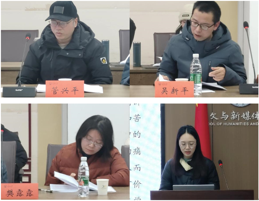 分会场A组围绕文学类展开论述,所涉及的选题内容广范,既有关于史铁生苦难书写的述论,又有拉康视域下安东尼那的形象解读。文学在不同时空中飞速穿梭,在不同领域发生碰撞激荡,久久回响。管兴平、袁飘、吴新平、樊露露四位老师根据每位同学的选题、论文内容、论文结构、学术规范等方面做出了细致的评价。