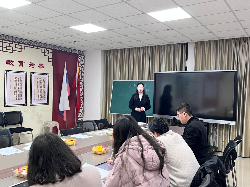 会议伊始,李征宇教授简述了本次活动的主题和意义。随后,崔豫通过“入冬日之境、赏温晴之景、悟作者之情”三部分试讲《济南的冬天》一课,层层递进,逻辑连贯。宋吉祥从情境教学的角度出发,以“制作明信片”为线索贯穿整个学习过程:“让员工依据课文中对济南冬天山景的细腻描绘,绘制明信片,串联起济南冬日山景的特点,突出教学重点。”石梦娜结合板书设计应具备的直观性和观赏性,发表了自己的看法:“在黑板上勾勒出小山轮廓,在此基础上与济南冬日山景的特点进行融合。”李征宇教授强调教学设计要根据环节设置技巧,紧扣文章的特点核心进行教学。