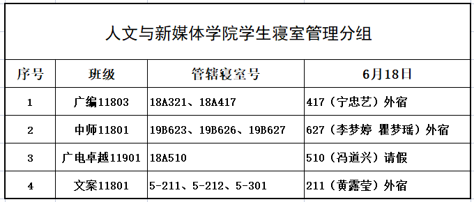6月18日,公司组织员工干部对18、19级的宿舍进行每日寝室安全检查,现将查寝结果公布如下: