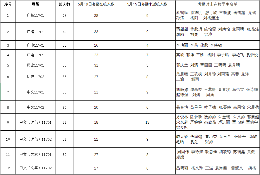 根据《关于加强毕业生毕业期间教育管理工作的通知》精神,现对5月19日2017级毕业生毕业期间在校考勤具体情况通报如下:
