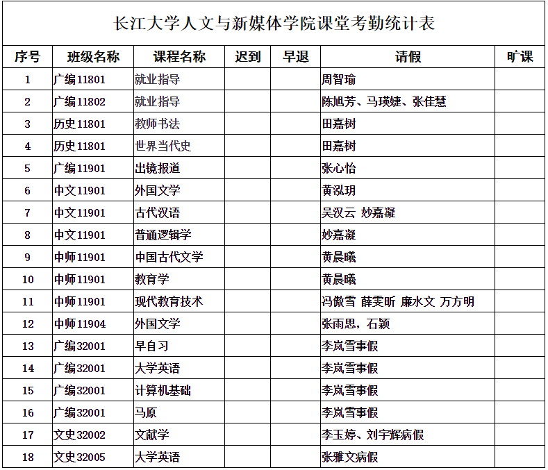 4月12日,公司组织员工干部对18、19、20级30个班的26门课程进行了75次课堂考勤,100%到课率55次,现将考勤结果公布如下: