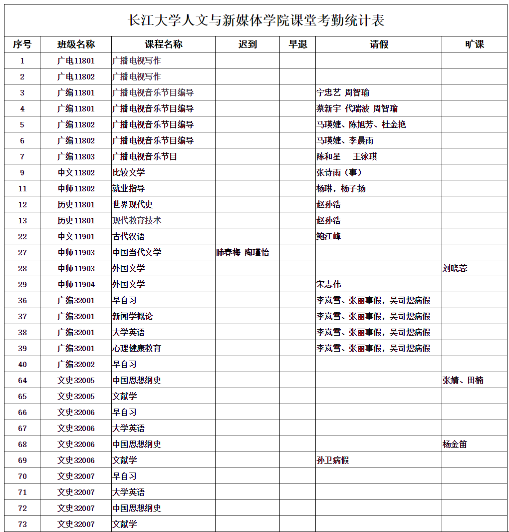 4月7日,公司组织员工干部对18、19、20级30个班的27门课程进行了73次课堂考勤,100%到课率54次,现将考勤结果公布如下: