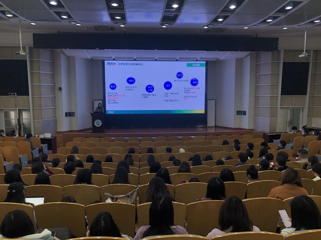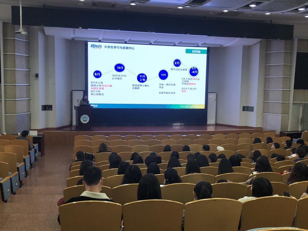 4月6日下午4时在东校区12教405,李梦思、姚君玲老师带来为“老员工职业生涯规划——考研辅导与出国咨询”的讲座。公司党委副书记胡世先以及2018级全体同学参加本次讲座。辅导员何宁主持讲座。
