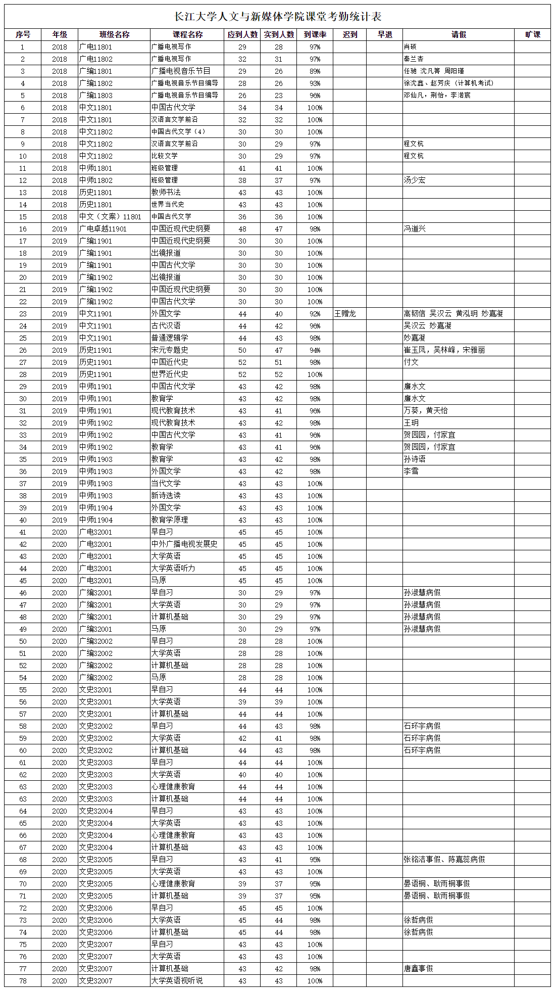 3月29日,公司组织员工干部对18、19、20级30个班的31门课程进行了78次课堂考勤,100%到课率43次,现将考勤结果公布如下: