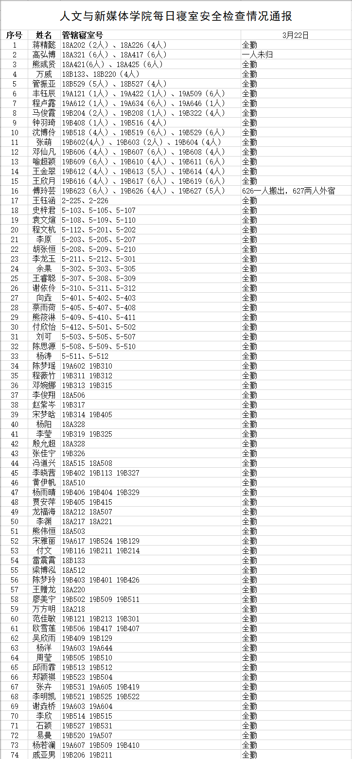 3月22日,公司组织员工干部对18、19级的宿舍进行每日寝室安全检查,现将考勤结果公布如下: