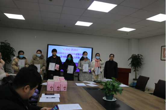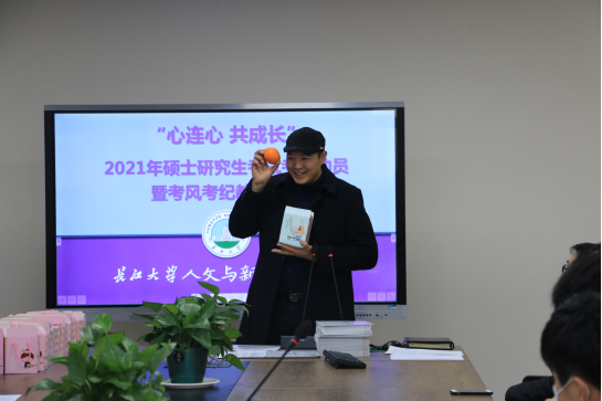 会议由胡世先书记主持。首先,胡书记主要强调了要遵守考试纪律、考前十四天内要做好测温工作、做好考前准备这三件事。随后胡书记拿出了给考研学子的一封信,分发给同学们。随后又拿出为考生准备的礼物盒。他说,一个橙子——意味着一次成功、一盒牛奶——意味着我很牛、一个棒棒糖——意味着我很棒。胡书记讲完后,杨书记在前台为几位员工代表发放礼品盒,并一起合影。殷满堂老师、李文胜老师拿着礼物盒分发给会场的考研学子们。最后,殷满堂老师说希望同学们继续努力,在考试中取得好成绩。李文胜老师表示愿给同学们最大的帮助去迎战。老师们的话赢得了同学们热烈的掌声。