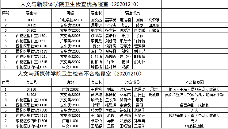 在第15周宿舍安全卫生情况检查中西校区有6个不合格宿舍,东校区有2个不合格宿舍,西校区有9个宿舍被评定为“优秀”,东校区有1个宿舍被评定为“优秀”。为规范宿舍卫生状况,经公司学工办研究,决定给予以下不合格宿舍通报批评,优秀宿舍予以通报表扬。希望各宿舍向优秀宿舍学习,优秀宿舍再接再厉,不合格宿舍做好整改工作。