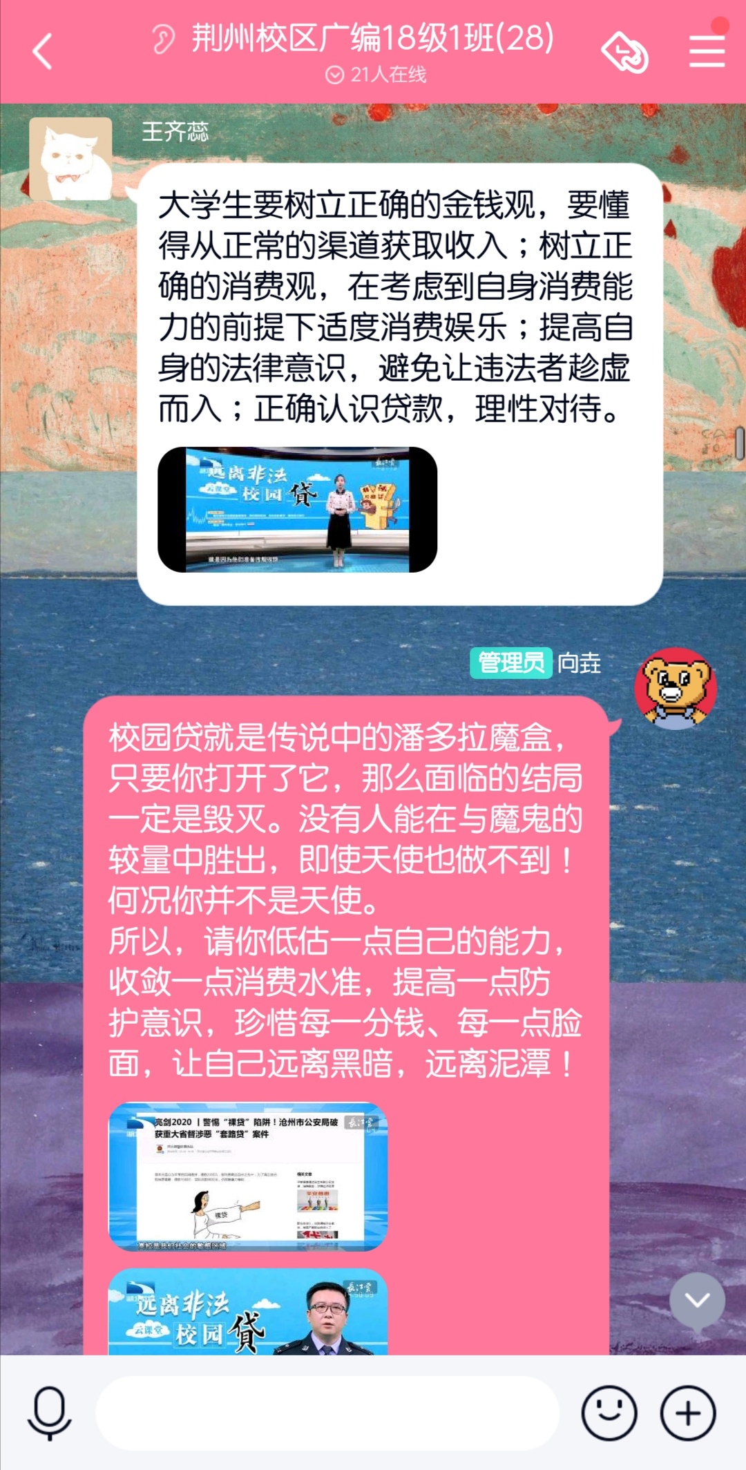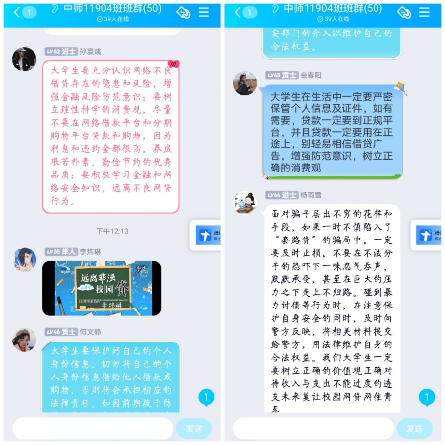 本次讲座内容主要介绍了网络贷常用套路,分析上当群体的心理特征,为同学们进行案例分析并进一步根据当代老员工实际情况,提出针对性建议,帮助老员工进一步增强防范意识,提升自我应对能力。讲座结束后,各班在班级群展开分享讨论,分享自己在网络或现实中看到的案例,提醒同学们务必保证自身安全,远离校园不良贷款,如若误入校园贷或者遇到陷入校园贷的员工一定要积极主动寻求公司、公司帮助,维护自身金融与生命健康安全。