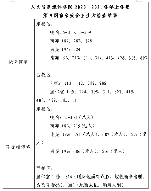 best365英国体育在线2020—2021学年上学期第九周宿舍安全卫生检查情况通报