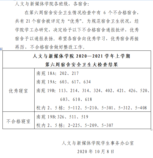 best365英国体育在线2020—2021学年上学期第六周宿舍安全卫生检查情况通报