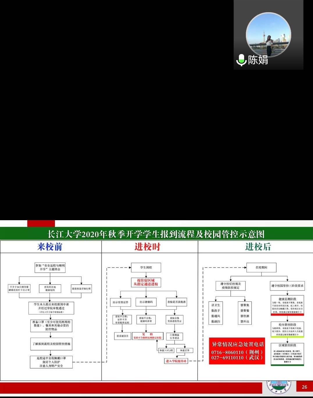 本次班会的内容主要分为员工返校前的准备、员工进校流程、员工到校后的校园管控、关注心理健康、学费缴纳与注册和学业规划六个部分,重点强调了开学前的各类注意事项和到校之后的各类须知,要求同学们在报道后遵守公司各类规章制度,加强常态化防控疫情,如有特殊情况及时向辅导员老师反馈。陈娟老师在会中强调“疫情尚未过去,仍需打起十二分的精神来面对它,谨防反弹,需要我们每个同学积极参与,期待疫情之后我们可以自由在校园中漫步。”会议的最后,陈娟老师嘱咐同学们珍惜宝贵的研究生学习生涯,与同学、老师之间形成良性互动模式,积极与导师交流,同学之间相辅相成才能有更大的成就。