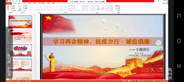 中文(师范)11701、11702团支部联合召开的6月主题团会中,由主持人播放ppt讲解两会政府工作报告、两会精神,以及传染病防控知识和诚信教育内容,让同学们详细了解我国2019年和2020年以来的政府工作以及对未来的战略部署,并在疫情期间,积极学习防控知识,最终对“学习两会精神,抗疫力行•诚信倡廉”这一主题有深入的了解;