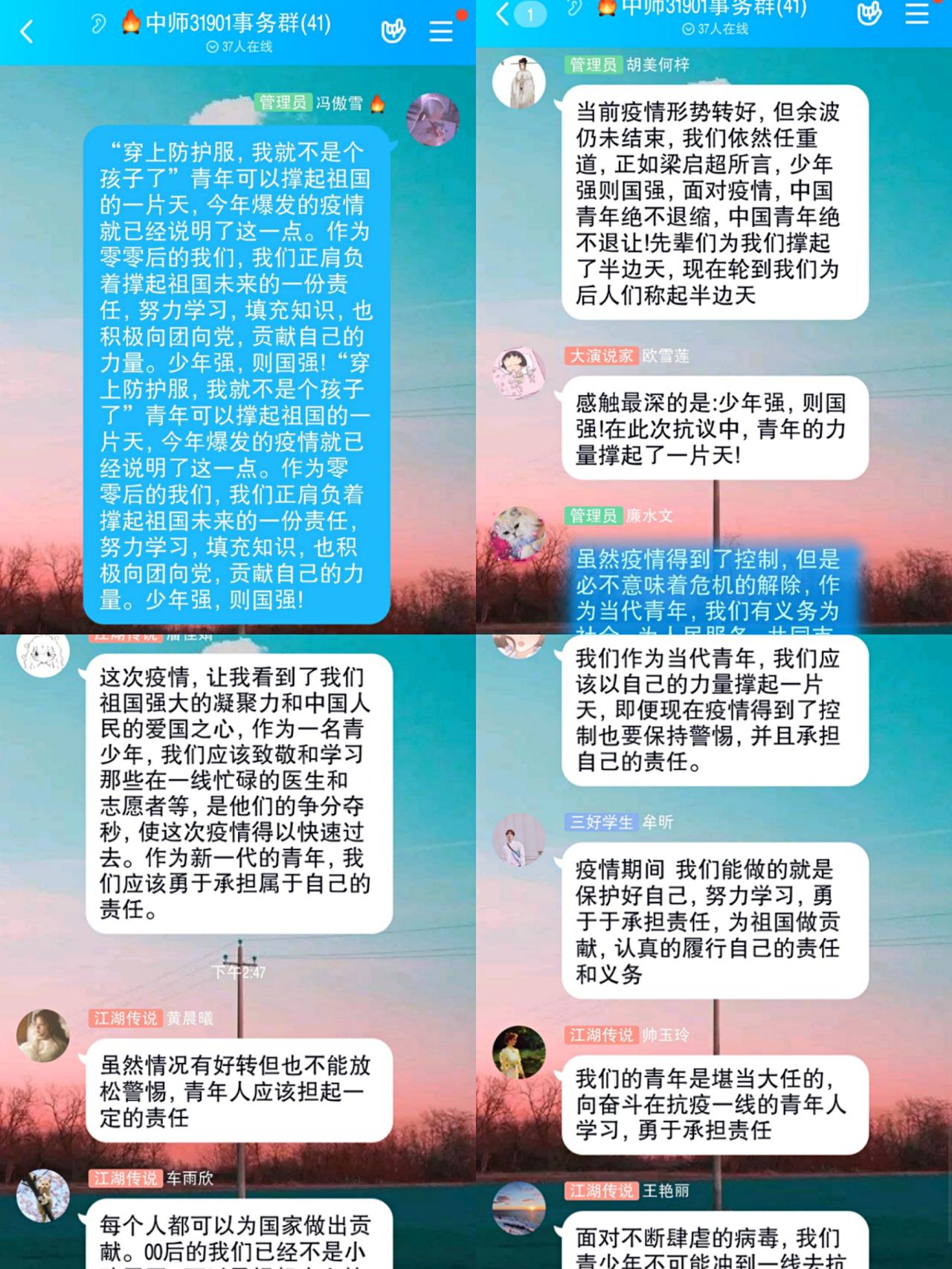 中文(师范)31901支部在线上召开了此次团会。团会过程中,同学们积极发言,表达各自的感受与见解!但无一例外都表达了对医护人员的敬佩,对勇担责任,共克时艰的中国青年的赞美。“我们的青年是堪当大任的,向奋斗在抗疫一线的青年人学习,勇于承担责任。”(黄晨曦)“作为00后的我们正肩负着撑起祖国未来的一份责任,努力学习,填充知识,积极向团向党,贡献自己的力量!”(冯傲雪)同学们诚挚的话语一次又一次的刷屏,其中是信心,是热爱,更是对责任的清楚认识。此次疫情是一场浩大的劫难,但他更是提炼了我们的民族凝聚力,锻炼了中国青年的责任与担当,让我们更加清楚的认识现状,深入学习,理智思考,共克时艰!