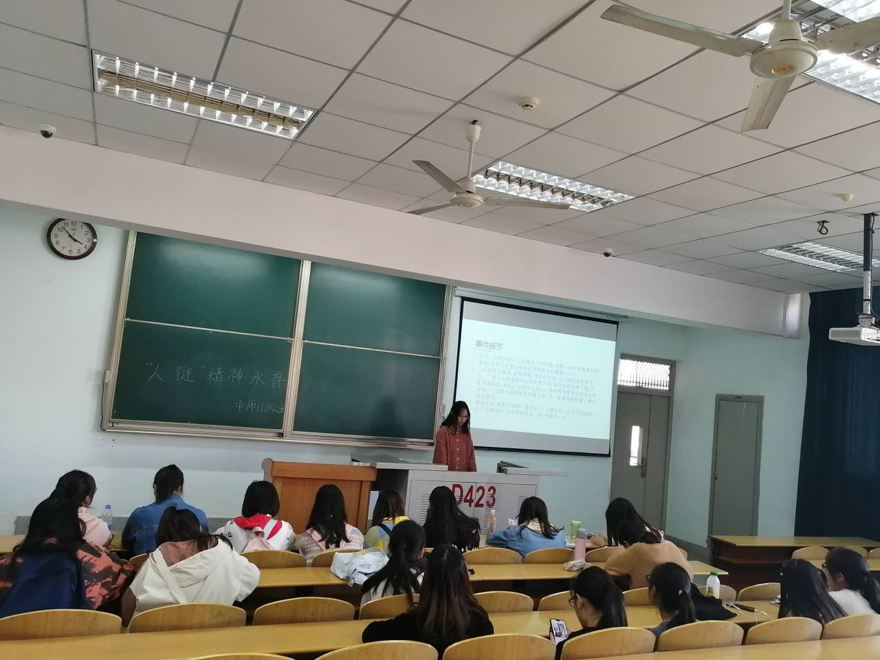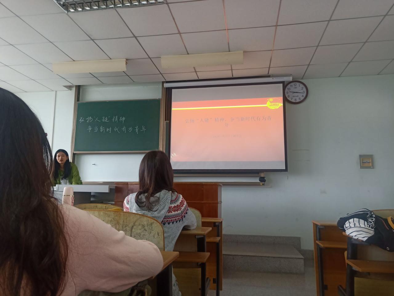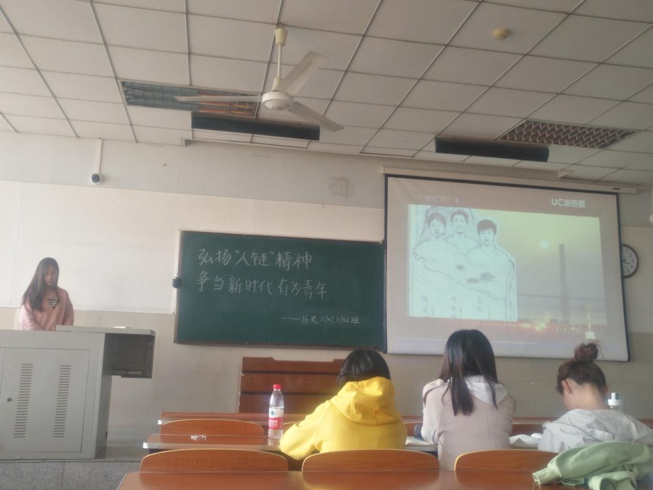 首先,由主持人播放ppt讲述老员工手拉手组成“人链”救人事件和“人链”精神及其带给我们的思考,让同学们详细了解“人链”精神并对“弘扬‘人链’精神,争当新时代有为青年”这一主题有深入的了解;