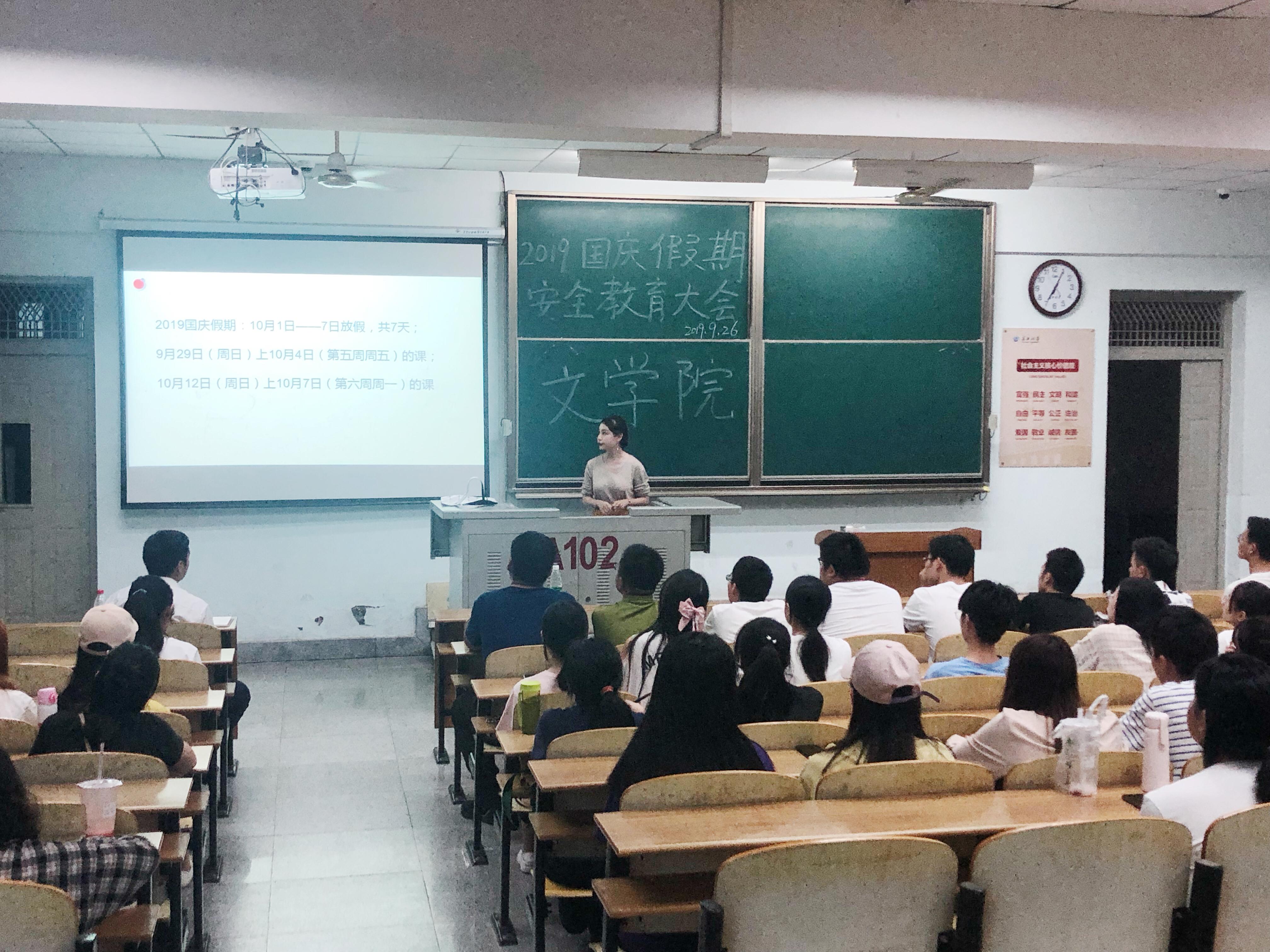 为进一步落实公司关于做好国庆节假期员工安全工作的通知要求,同时为了提高同学们的安全防范意识,9月17日至28日,公司分年级在东、西校区召开国庆假期安全教育大会。大会分线上教育和线下教育两种形式、由相应年级辅导员主讲。