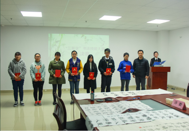 最后的颁奖仪式总是令人期待的,罗桥林荣获粉笔组三等奖,何柳、徐慧涵、李欢荣获硬笔组三等奖,赵雨轩、要慧妍、陈曦荣获软笔组三等奖;何柳荣获粉笔组二等奖,鲁雪怡、金辉荣获硬笔组二等奖,刘香花、袁静仪荣获软笔组二等奖;来自文公司的刘晨阳和张留馨分别摘得粉笔组和软笔组的桂冠,来自管理公司的罗桥林获得硬笔组的第一名,由三位嘉宾和评委老师为他们颁奖。最后,所有评委老师与参赛选手在横幅上签名并合影留念,best365英国体育在线第六届“三笔字”大赛完美落幕。