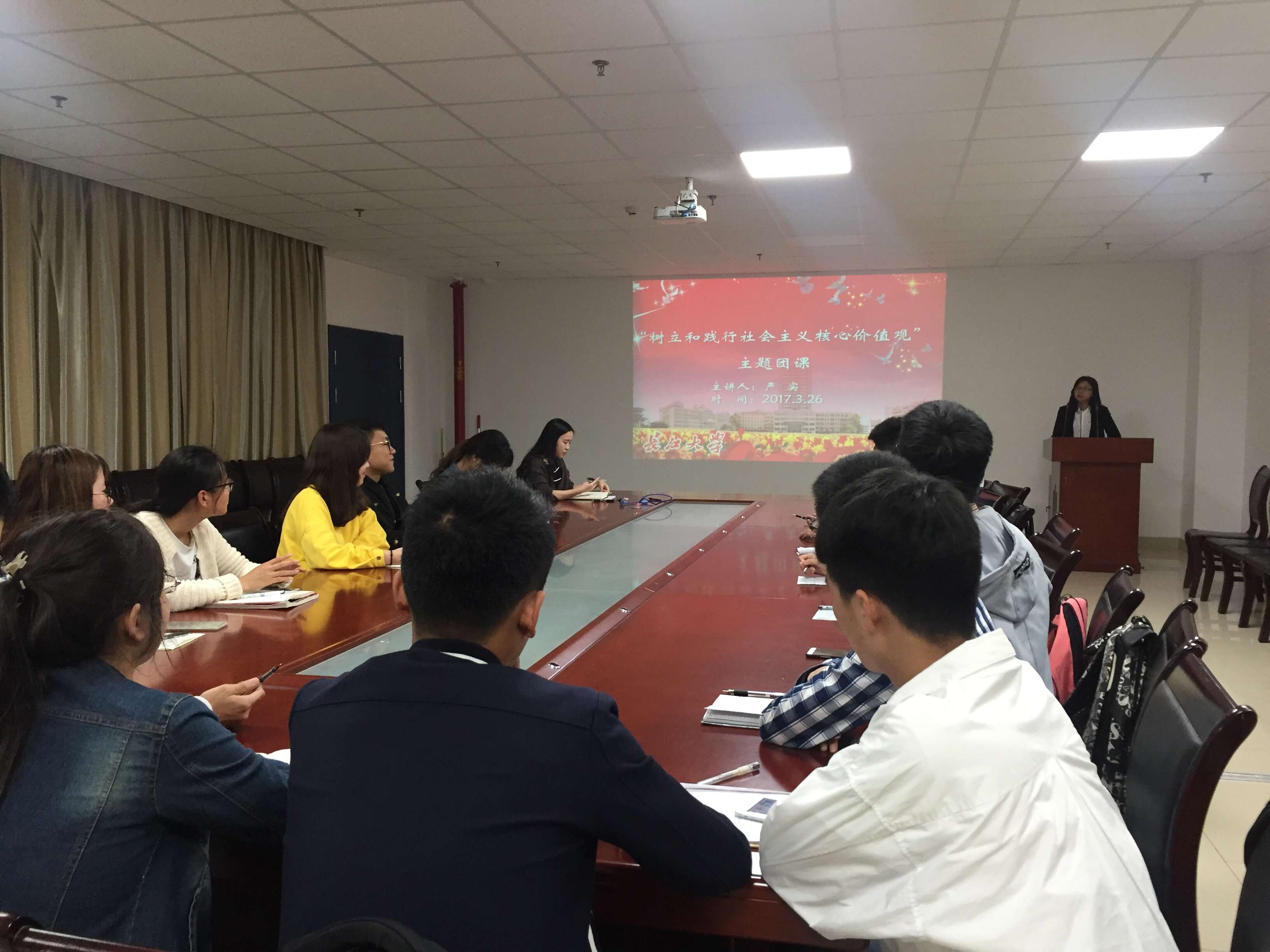 随后,严实老师就工作任务做了大致分工,宣传部要一如既往做好舆论宣传推广工作,充分利用现有各种途径,积极地在院里班里宣传。组织部依旧需要做好团建工作,让每个团员接受良好的组织生活锻炼,都有意识去自觉学习和践行社会主义核心价值观。各位团支书也要积极配合院里工作,让班级员工积极践行,认真学习2013年5月4日习近平总书记在同各界优秀青年代表座谈时的重要讲话。