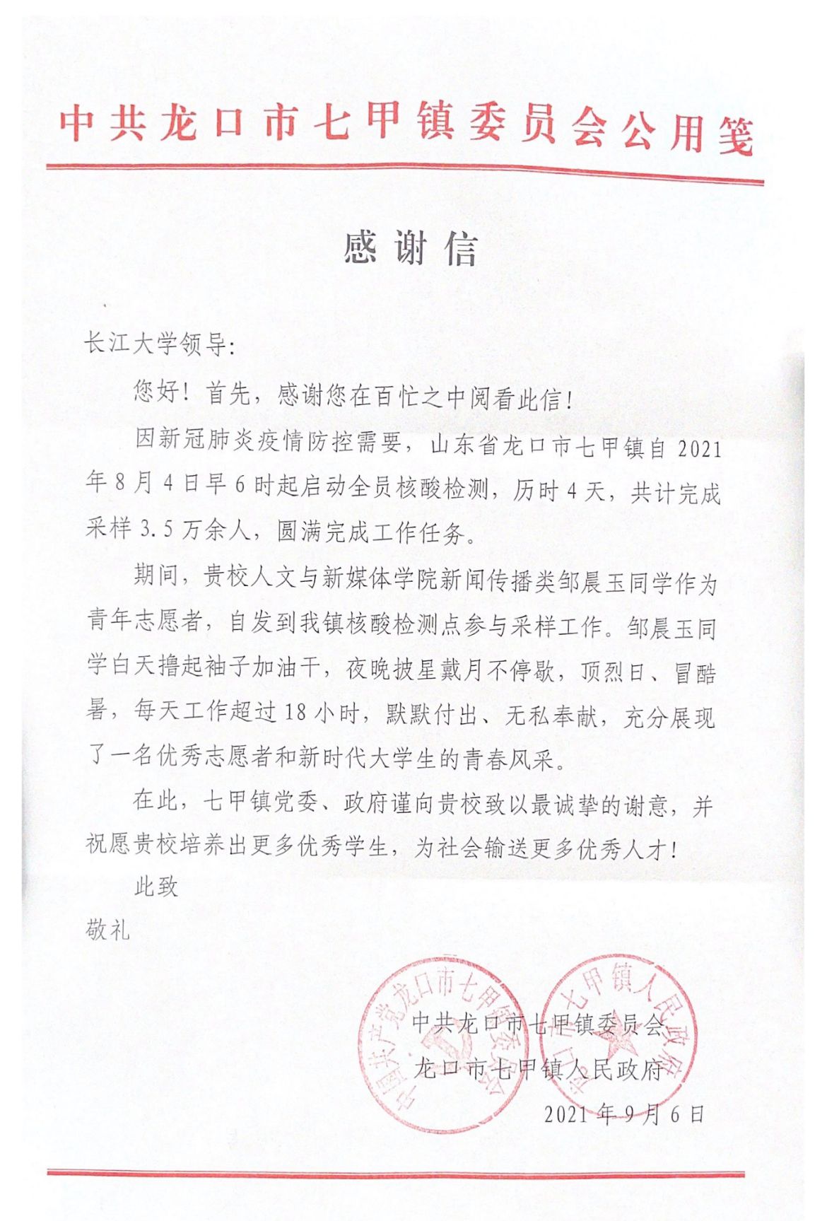 近日,公司收到山东省龙口市七甲镇感谢信,当地政府对公司学子表达了感谢。8月4日,热浪与疫情共同来袭,因新冠疫情防控需要,山东省龙口市紧急展开全员核酸检测,公司大一新生邹晨玉自发到龙口市七甲镇参与核酸采样志愿服务活动。