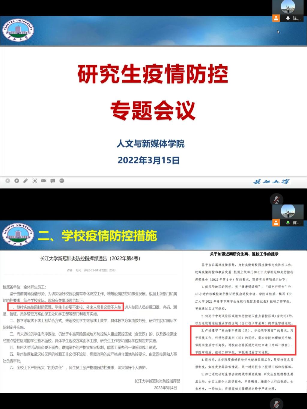 为切实做好校园疫情常态化防控工作,统筹疫情防控和事业发展,根据公司防控要求,公司全体辅导员、班主任于3月15日至17日,采取线上+线下相结合的方式,面向全体本科生和研究生开展了“疫情防控”主题班会。