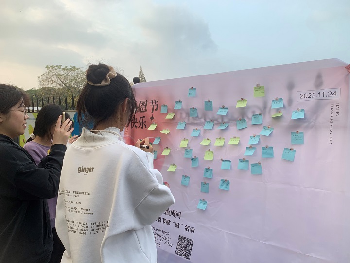 活动通过到梦空间设置进行宣传,分线上和线下两种参与方式。线上通过使用Fotoo微信小程序征集员工感恩节投稿,最后汇总为视频在大屏幕展览及在公众号展示。线下设置摊点,供同学们写下感恩寄语,并张贴在活动海报上。感恩是中国传统文化的一种,植根于中国的“孝”文化里。子曰:“夫孝,始于事亲,终于立身。”因此特别借以感恩节让同学用眼睛去看,用耳朵去听,用心灵去感受什么是感恩,从而在自己的心中培植一种感恩的情感,无论对待父母、老师或朋友,都能以一颗感恩的心去面对。