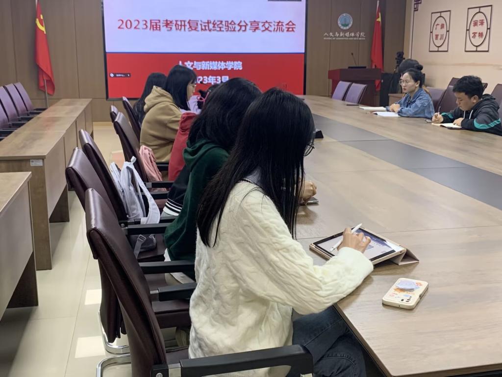 为做好公司考研员工复试指导,增强公司考研学子复试信心。3月10日晚7:00,公司在文科楼705会议室举行2023届考研复试分享交流会。本次分享交流会特邀湖南师范大学梁欣玥、湖北大学余跃,以及本校员工李靖、李应美主讲,田华蓉老师主持,19、20、21级员工参与。