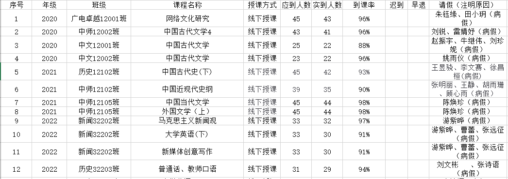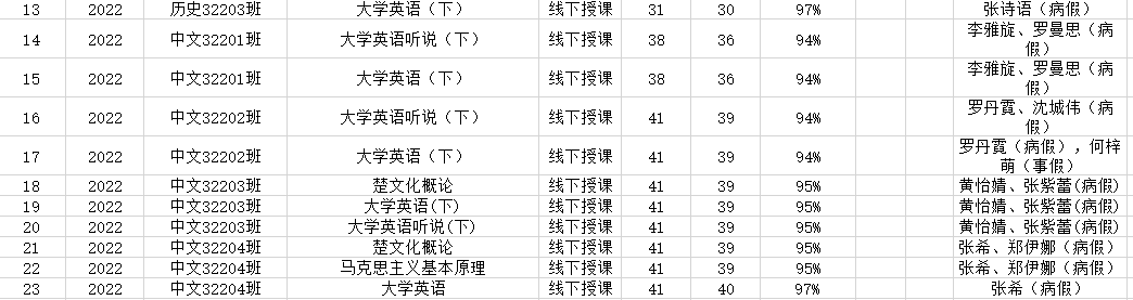 5月22日,公司组织员工干部对20、21、22级30个班的20门课程进行了58次课堂考勤,100%到课率35次,现将考勤结果公布如下: