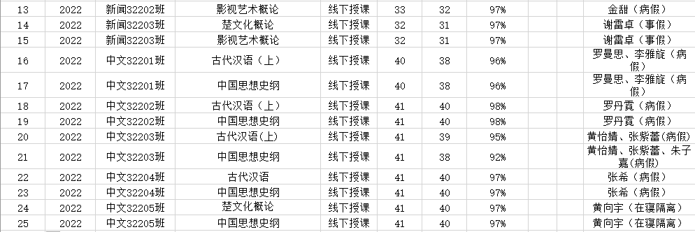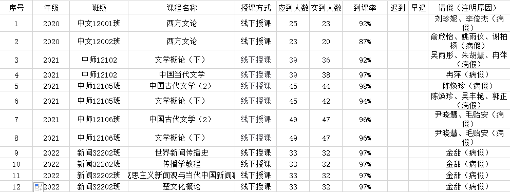 5月23日,公司组织员工干部对20、21、22级26个班的20门课程进行了51次课堂考勤,100%到课率26次,现将考勤结果公布如下: