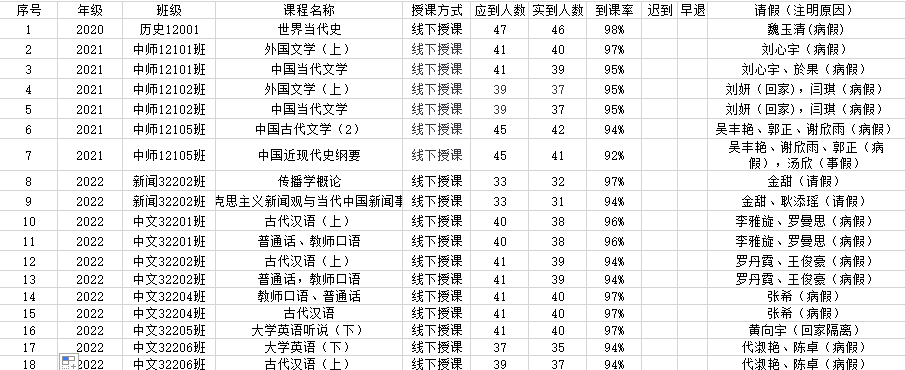5月25日,公司组织员工干部对20、21、22级21个班的18门课程进行了40次课堂考勤,100%到课率22次,现将考勤结果公布如下: