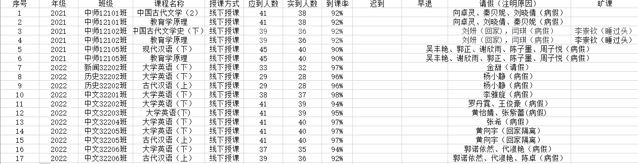 5月26日,公司组织员工干部对20、21、22级20个班的13门课程进行了38次课堂考勤,100%到课率21次,现将考勤结果公布如下: