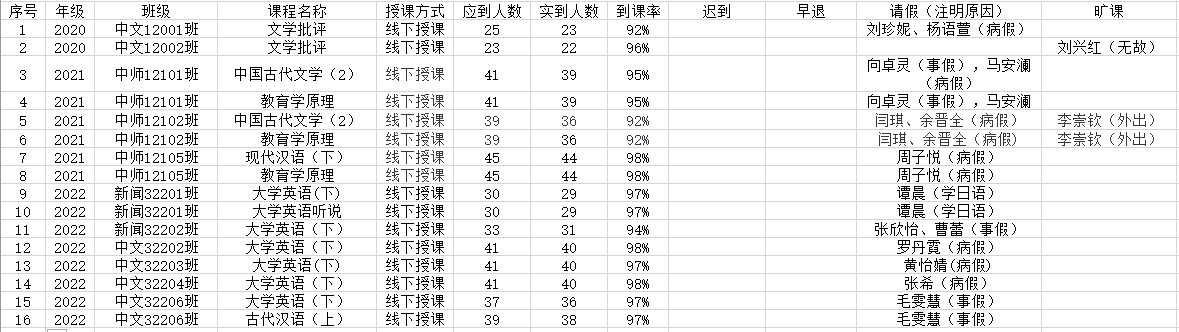 6月2日,公司组织员工干部对20、21、22级23个班的13门课程进行了39次课堂考勤,100%到课率23次,现将考勤结果公布如下: