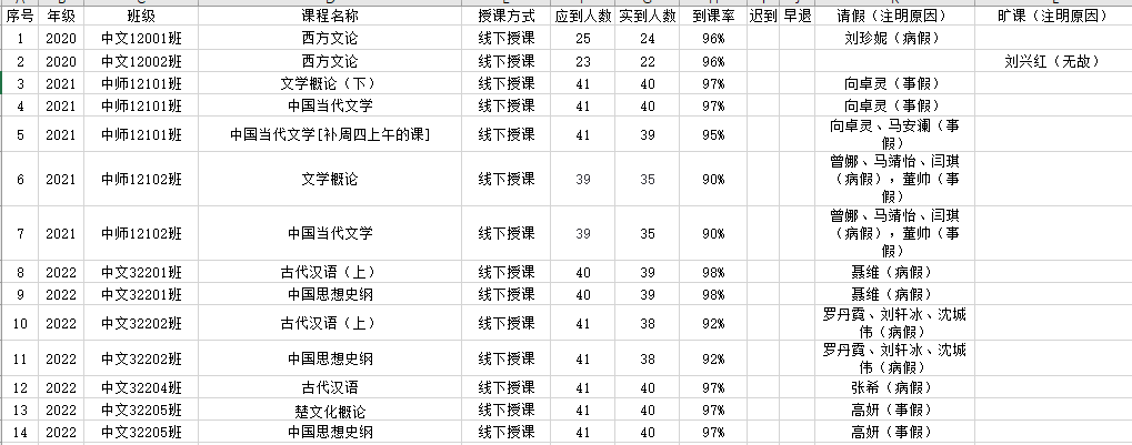 6月6日,公司组织员工干部对20、21、22级23个班的17门课程进行了45次课堂考勤,100%到课率23次,现将考勤结果公布如下: