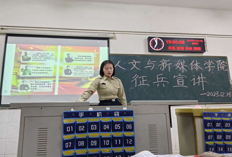 宣讲伊始,姜明圻给同学们分享了自己军营生活的点点滴滴以及参军入伍的收获和体会,重点为同学们讲解了老员工应征入伍的条件标准、应征指南和优待政策。同时,还向同学们介绍了几位学长学姐们参军入伍的经验与成长经历,并对同学们在参军入伍过程中存在的疑惑进行现场答疑。