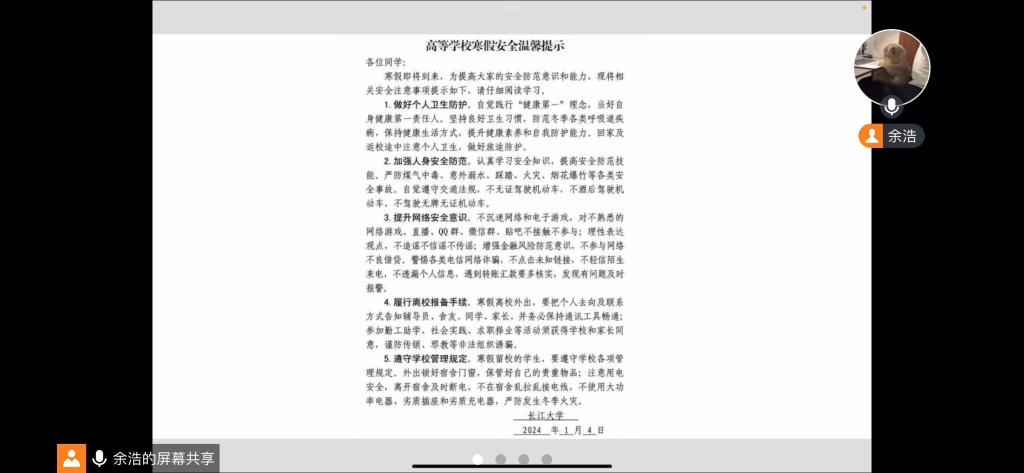 寒假临近,为增强研究生的寒假安全意识,提高研究生的安全素养,度过一个安全快乐的假期,1月5日-18日,各班召开了寒假安全教育主题班会。