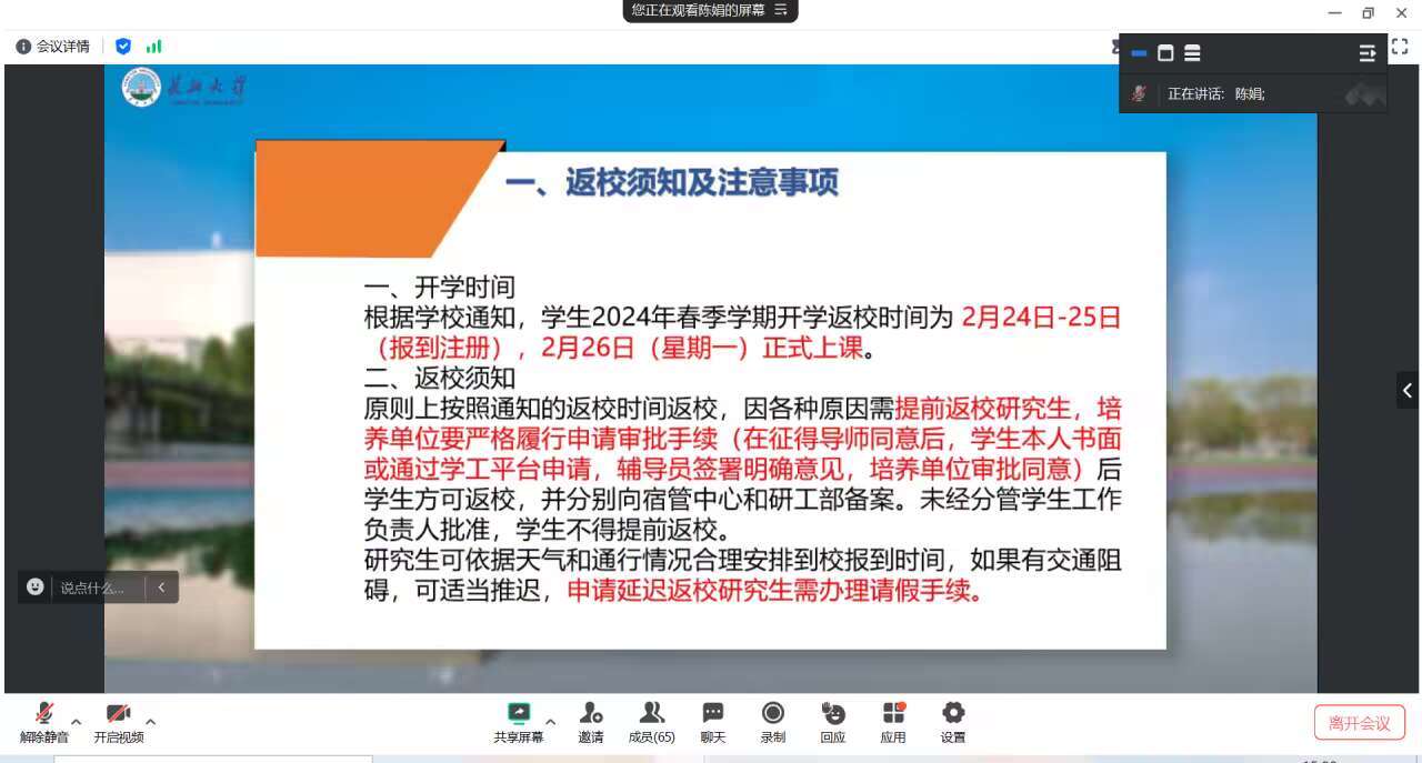 会上,陈娟老师详细讲解了返校须知、返校要求及返校安全等事宜,如因天气原因或特殊情况可申请提前或延迟返校,强调安全第一的原则。同时提醒同学们密切关注寒潮低温冻雨天气,注意出行交通安全,提高安全意识。此外,陈娟老师对同学们返校后的学习生活也进行了提示。
