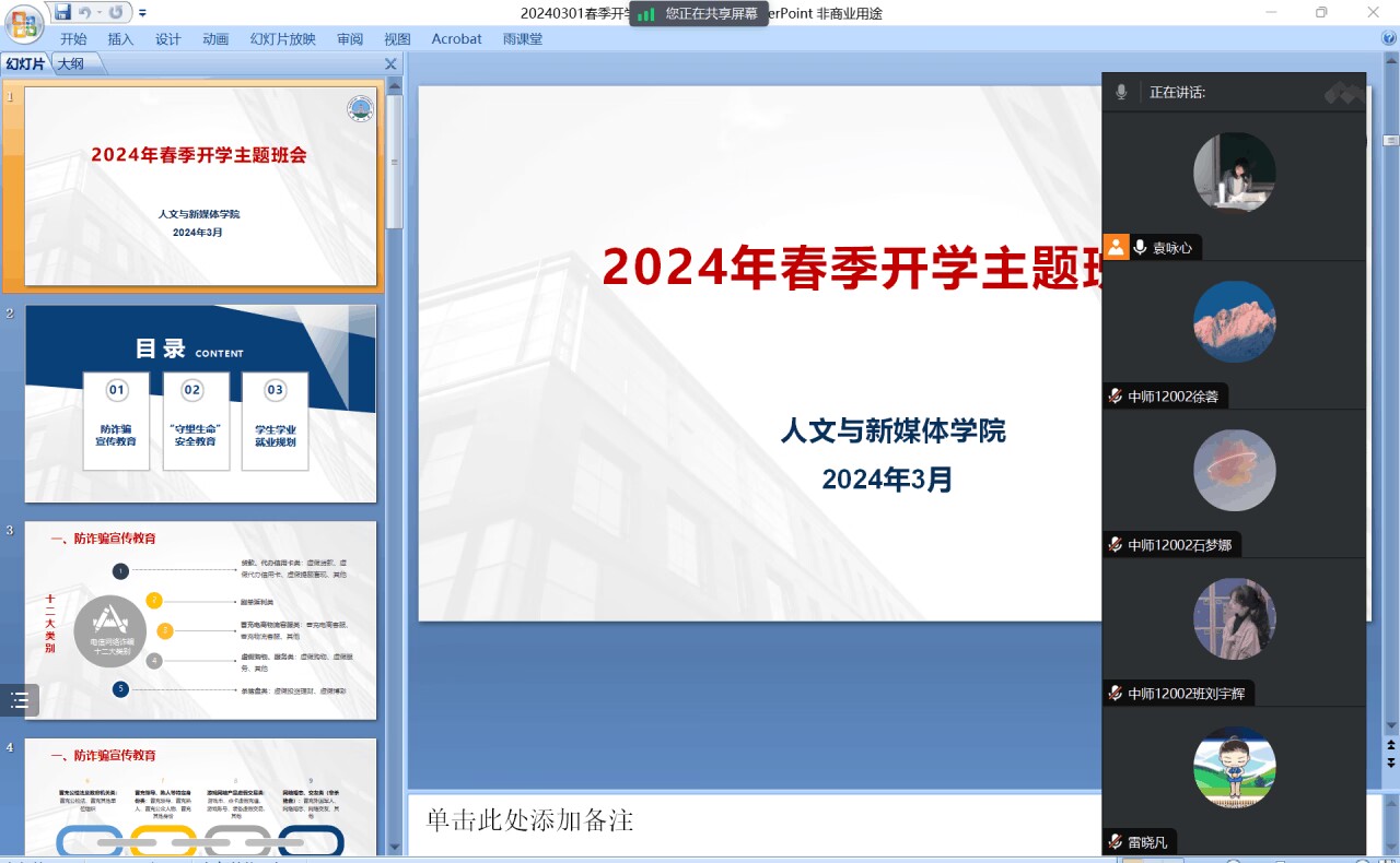 (通讯员 滕明桂)新学期新起点,为落实公司2024年春季学期系列教育引导活动工作,促进同学们以良好的精神风貌投入到新一年的学习生活,公司组织各班级开展新学期开学主题班会,营造了积极进取、团结和谐的良好氛围。公司党委副书记竺正海,各年级辅导员、班主任全程参与。