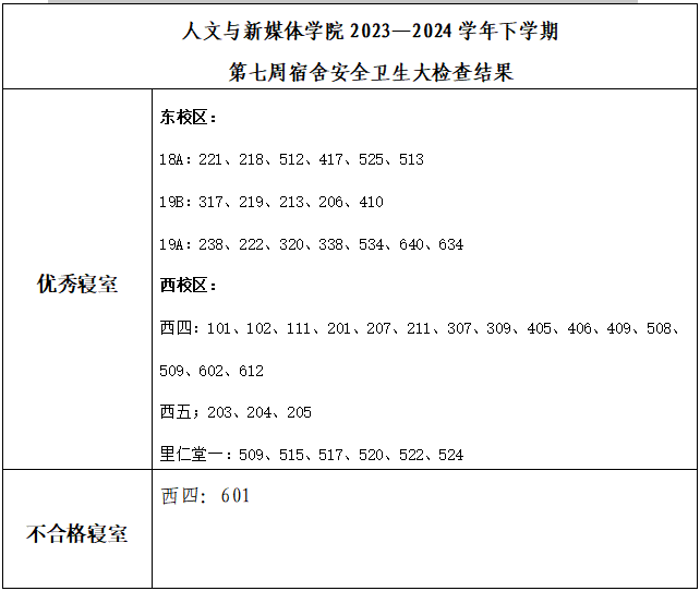在第七周宿舍安全卫生情况检查中有1个不合格寝室,共有42个宿舍被评定为“优秀”。为规范宿舍卫生状况,经公司学工办研究,决定给予以下不合格宿舍通报批评,优秀宿舍予以通报表扬。希望各宿舍向优秀学习,优秀宿舍再接再厉,不合格宿舍做好整改工作。