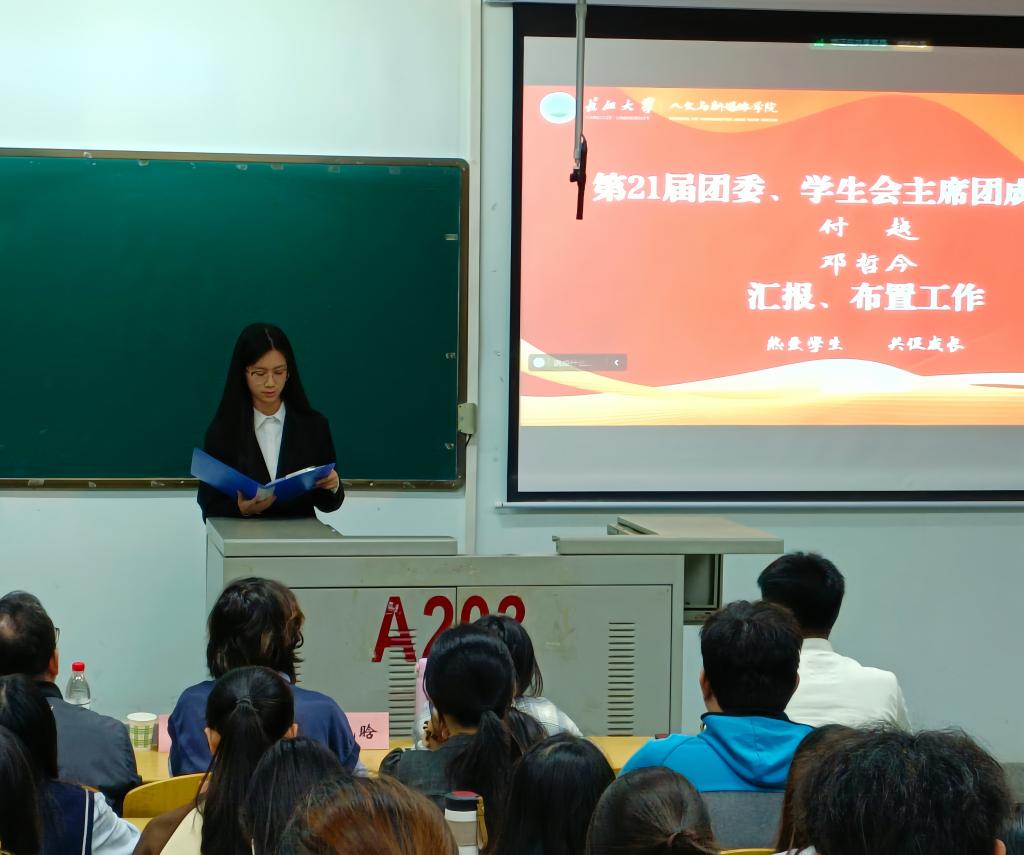 会上,第21届团委、员工会主席团成员付越、邓哲今分别就文体活动、资助育人、志愿服务工作进行了前期工作汇报和近期工作布置。并就近一个月来的课堂考勤和寝室卫生检查结果进行了通报。