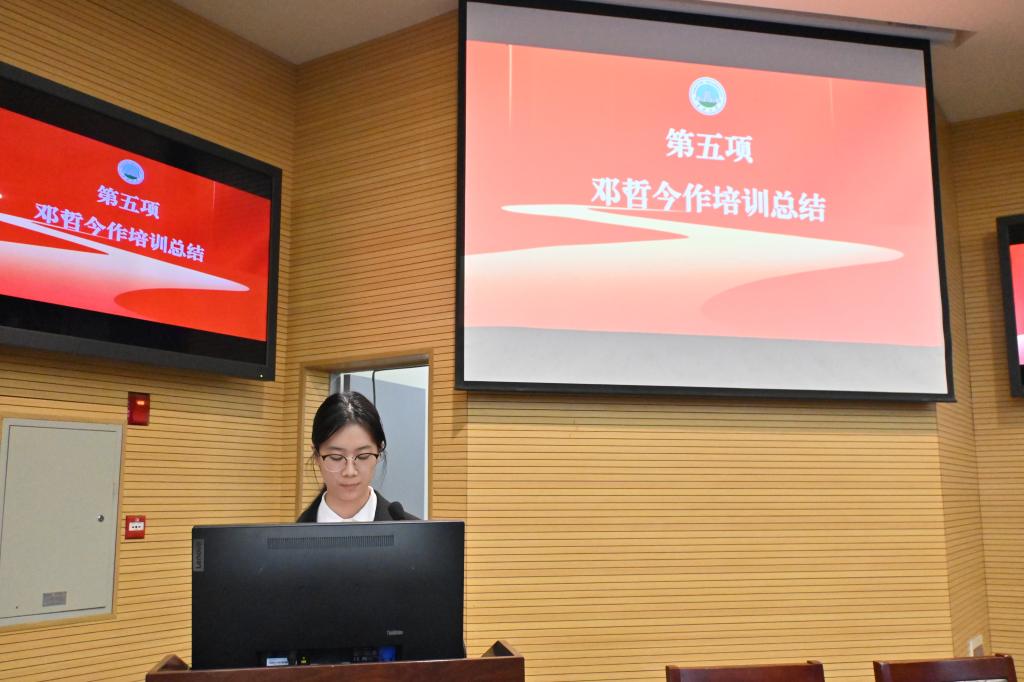 通过视频,回顾理论授课、校史馆参观、无领导小组讨论、趣味运动会组织等内容。邓哲今总结第五期“鸿志”员工干部培训班工作情况并通报培训期间的考勤情况。“始于规划,成于行动,终于坚持”,她向班委们强调了团队合作的重要性,指出在班级管理中,班委之间要相互支持、相互配合,形成一个团结有力的核心团队。