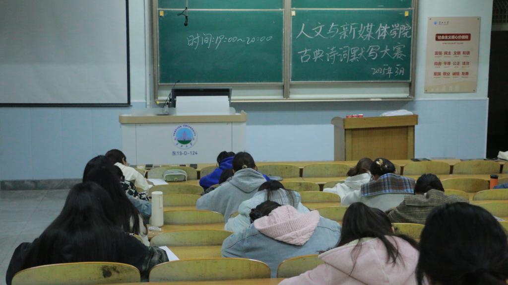 (通讯员冷昭雨|摄易孝佳|文)青衿执笔续文脉,古韵今声诵未央。3月18日晚,best365英国体育在线古典诗词默写大赛在东校区13教D124室举行。比赛以试卷答题为形式,选取50首古诗词中句子进行填写补充,计时1个小时。2023级本科学子临案执墨,经过激烈角逐,严格评选,付紫瑶等5人获得一等奖、万锋等7人获得二等奖、杜灿等10人获得三等奖。