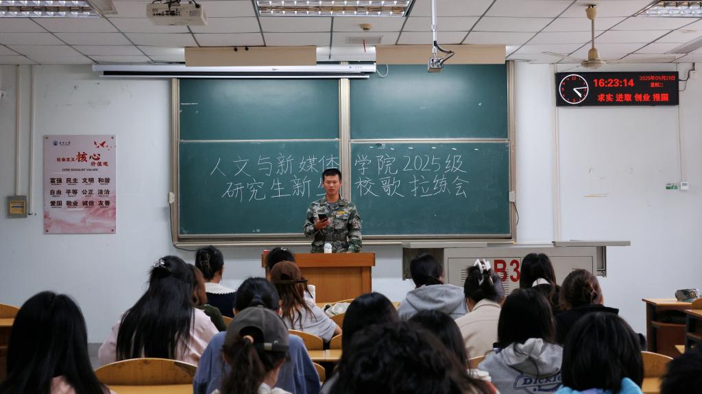 随后,学硕班、专硕班联合举办校歌拉练会。教室里,同学们精神饱满,在周杨同学的带领下,一遍遍练习旋律,熟悉歌词。从最初对旋律的生疏,到后来逐渐跟上节奏,再到最后能够整齐且富有感染力地唱出完整的校歌。整个过程中,每一位同学都认真专注,以激昂歌声展现了长大学子积极向上的精神面貌。各班级还将学唱校歌活动延伸至宿舍,以“共学共唱”让宿舍成为学唱校歌的新阵地。