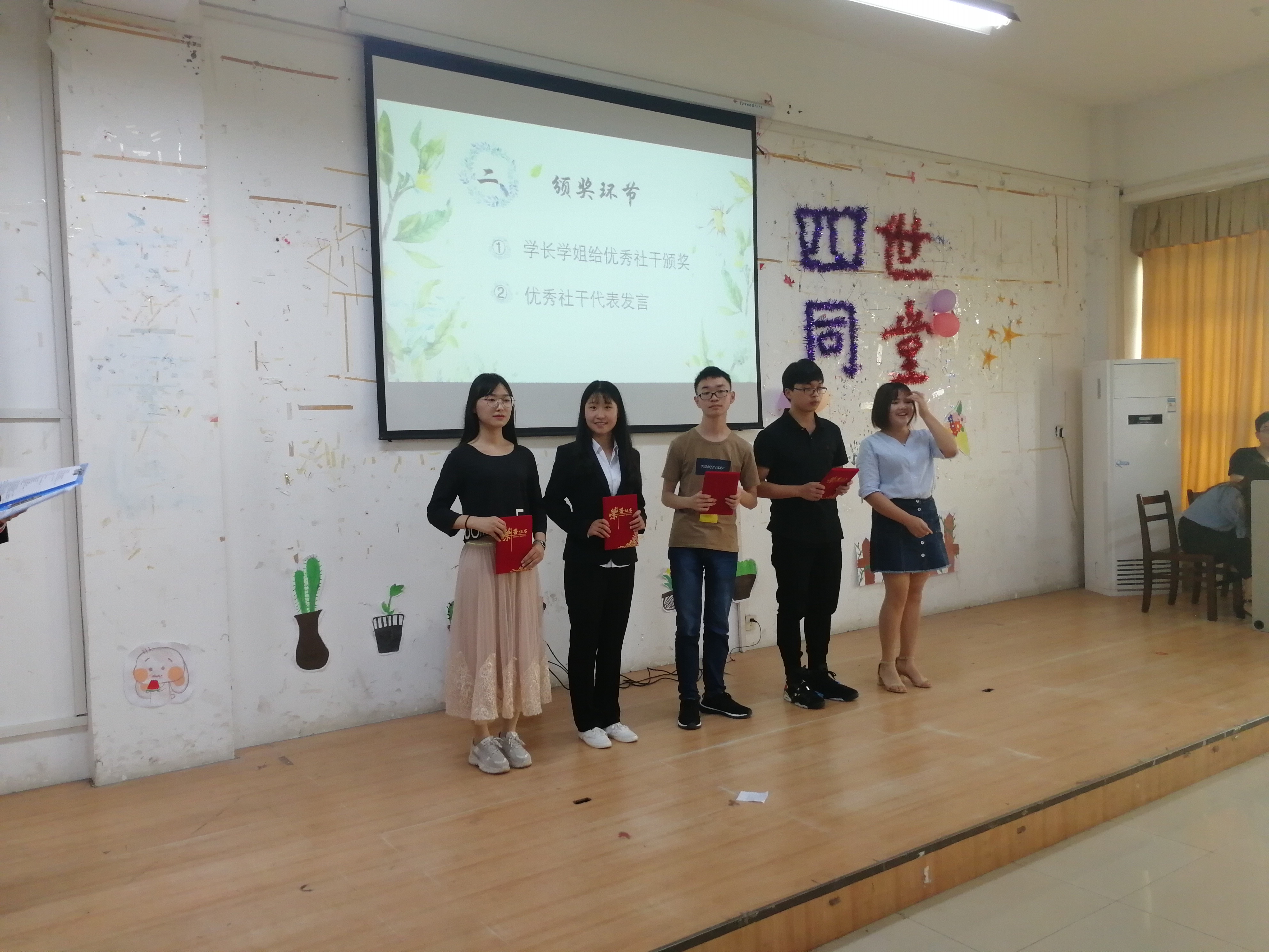 其间,姚灿、樊虹均、吕景伟、段华博和李科分别为我们带来了动听悠扬的歌曲,不同风格,各有千秋。活动到达中场时进行了颁奖仪式,由大四的学长学姐给优秀部门及十六位优秀社干颁发证书,以示不忘初心,继往开来。其中优秀社干代表胡亚楠,就自己一年的工作经历作了发言,分享了自己的工作心得,以及在工作中的收获。
