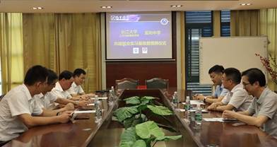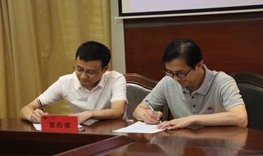 监利中学董事长覃忠介绍公司基本情况,并和公司党委书记杨克非在共建协议上签字。