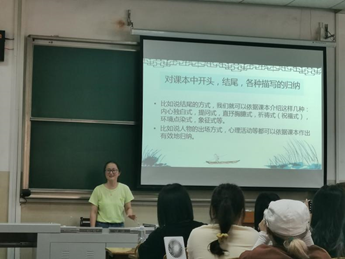 杨溯琴老师授课的主题为“我的语文教学成长之路”。杨老师首先就自己的实习经历与同学们展开互动,她认为,作为语文教师要熟悉课本,要引导员工从生活中发现美、寻找细节,并指出训练员工思维的重要性。接着,她向大家展示了自己班级员工的优秀作业视频,告诉同学们,在教学过程中关注员工是非常重要的,培养员工也是一位教师的重要成长之路。杨溯琴老师还强调,在教学中需要引导员工观察生活、回归真情,从而打造快乐轻松的语文课堂。