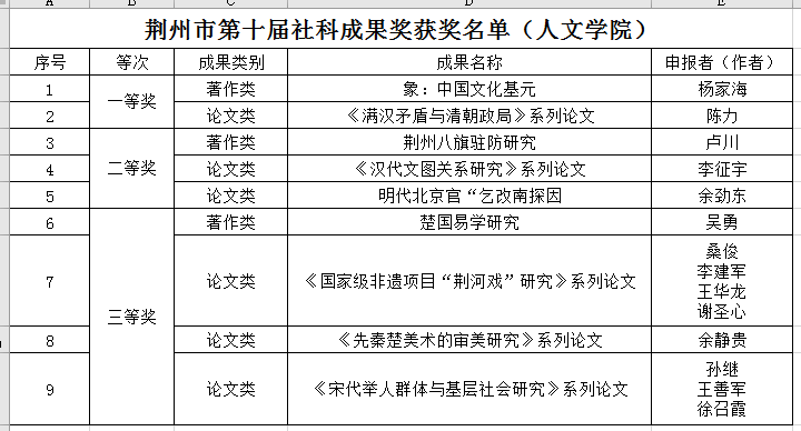 荆州市社科成果奖是荆州市社科领域的最高奖励,每两年颁发一次,本次参评的是2017-2018年度的社科成果,共计评出48项优秀成果,由公司教师主持完成的成果获得其中9项奖励,占全部奖励的六分之一强。其中陈力、杨家海获得一等奖,卢川、李征宇、余劲东获得二等奖,吴勇、桑俊、余静贵和孙继获得三等奖,体现出公司在人文社科研究领域的突出实力。