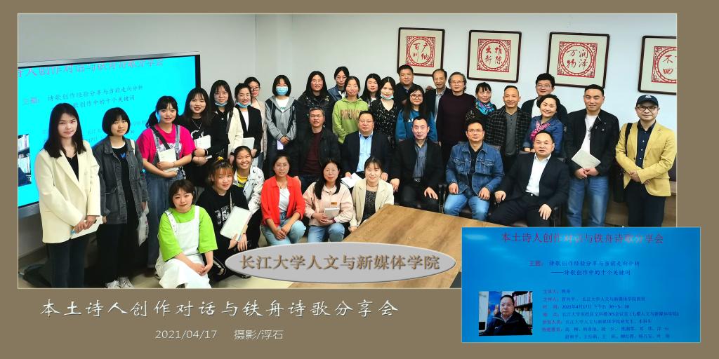 (通讯员 宋静静)2021年4月17日下午14时许,本土诗人创作对话与铁舟诗歌分享会在文科大楼705召开。本次活动由管兴平教授主持举办。荆州诗人铁舟(原名覃文平),以“诗歌创作经验分享与当前走向分析——诗歌创作中的十个关键词”为主题开讲。高柳、杨章池、陵少、郑伟、浮石、舒和平、王经砺、王跃、柳红霞、杨万安、叶俊、宋世平、毛运秀十三位荆州诗人为特邀嘉宾,人文与新媒体部分研究生、本科生参加本次活动。
